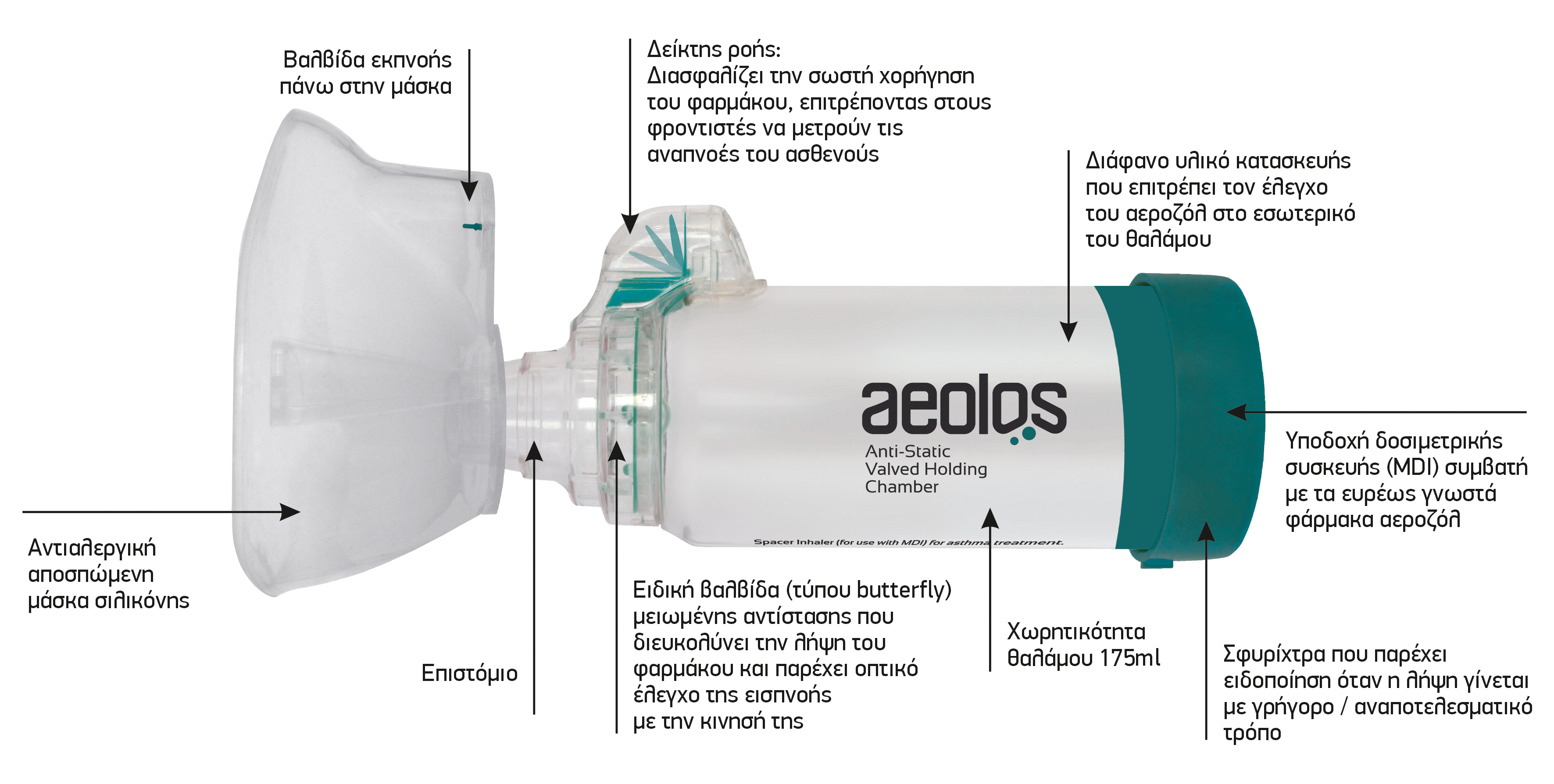- Η μάσκα πρέπει να παραμείνει εφαρμοσμένη στο πρόσωπο του ασθενούς για 5-6 εισπνοές με την χορήγηση ενός ψεκασμού.