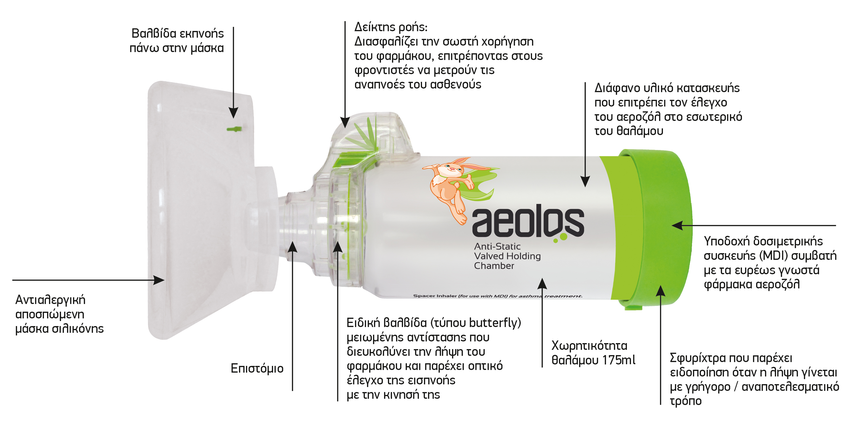 • Υποδοχή δοσιμετρικής συσκευής (MDI) συμβατή με τα ευρέως γνωστά φάρμακα αεροζόλ.